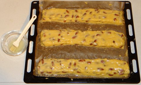 Brush the logs with the egg white. While you are brushing, you can also brush the logs into shape. The logs tend to spread out too much which will lead to cantuccini that are too long. So brush firmly along the edges to make them narrower.