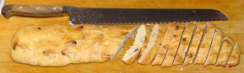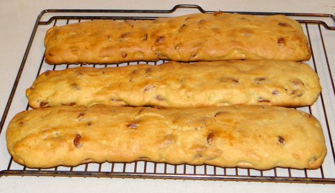 As soon as the logs are cold enough to handle, cut diagonally into cantuccini about 1 cm (1/2 “) wide with a sharp serrated knife.