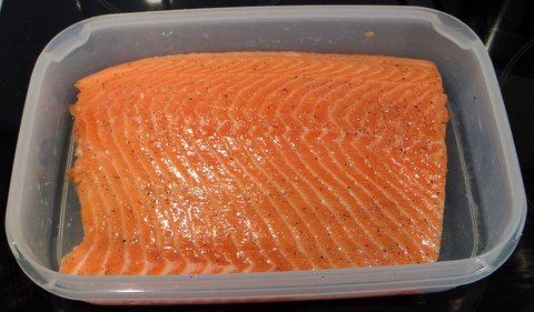 Rub the salmon fillet generously with salt, freshly ground black pepper, and freshly squeezed lemon juice. Cover and refrigerate for an hour (or up to 4 hours or so).