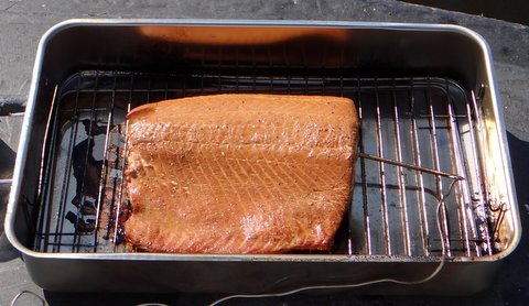 Set up the stovetop smoker with beech dust. Insert the probe of an instant-read thermometer into the salmon (make sure the tip of the needle is deeply embedded in the thickest part).