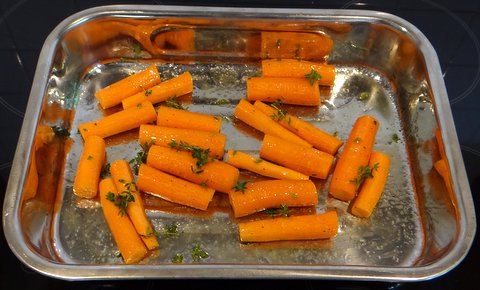 Preheat oven to 225C/425F. Peel the carrots and cut into chunk. Toss in a baking dish with olive oil, salt, freshly ground pepper, and 1 Tbsp thyme.