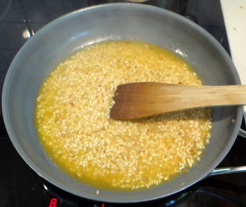 Add the rice and toast for a few minutes until the edges of the rice become translucent.