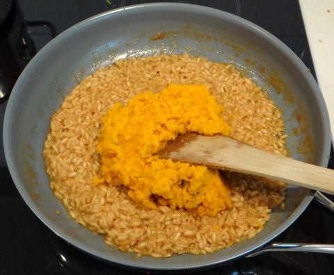 Add the carrots to the risotto and stir, cook for a minute longer.
