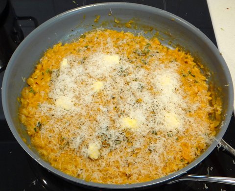 Take the risotto of the heat. Add 2 Tbsp freshly grated parmigiano, the remaining 1 Tbsp butter and the remaining 1 Tbsp thyme. Stir to mix.