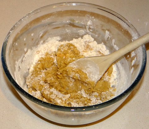 Keep mixing until the dough comes together. It needs to be slightly sticky. If it is too dry, add a bit of wine. If it is too sticky, add a bit of flour.