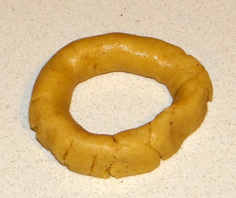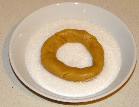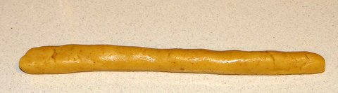 Take a piece of dough and roll it out (just like playing with playdough) to a size about the thickness of your finger and about twice as long. (I am assuming here that you will like bigger cookies if you have bigger hands. 😉