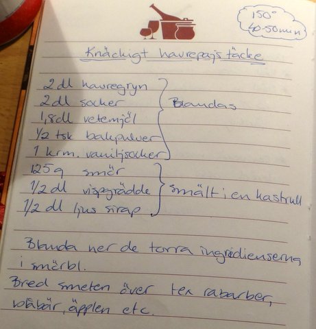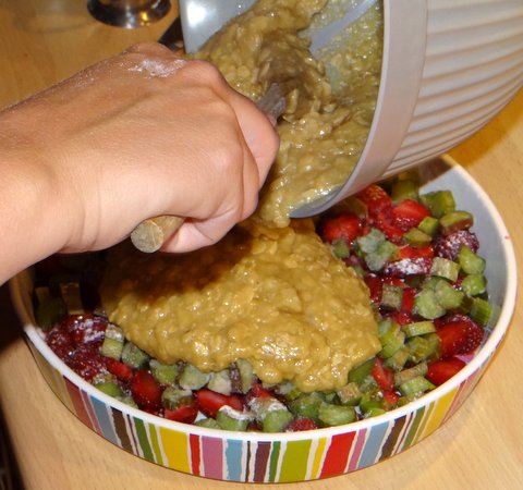 When we were visiting our friends Tina & Magnus in Sweden, Tina made this wonderful dessert for us: rhubarb and strawberries topped with an oats crust and baked in the oven. I watched her making it and took some photos, and thought it was delicious so I got her permission to share the recipe with you.