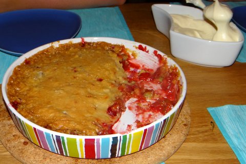 Serve with whipped cream (whip cream with sugar until thick). Can be either served warm (with a soft topping) or at room temperature (with a crispy topping).