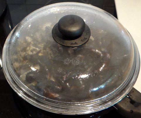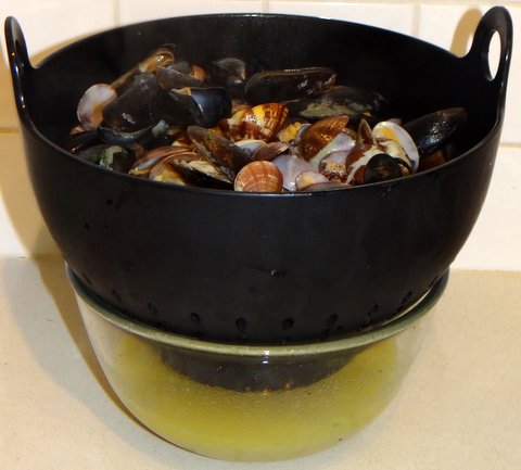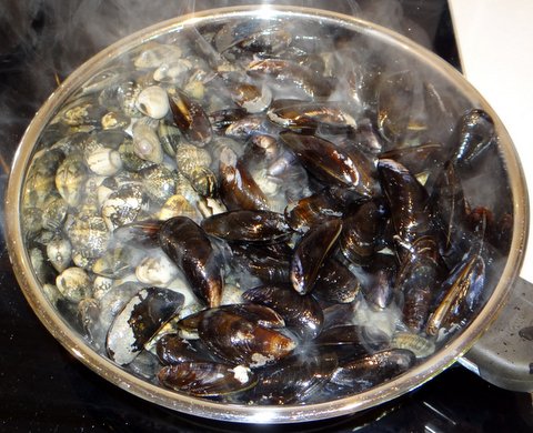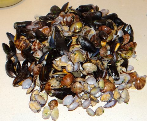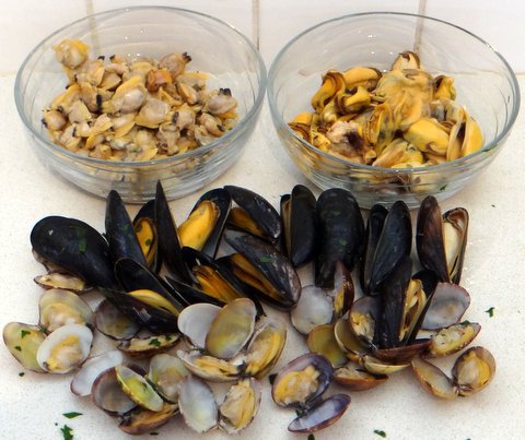 Take most of the meat out of the shells and discard the shells, but reserve some nice looking mussels and vongole for decoration.