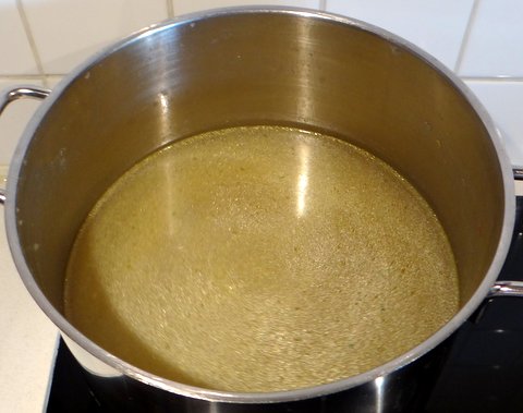 Mix the fish stock with the clam juice (and the shrimp stock if you made it). Heat this to a temperature of about 55C/130F.