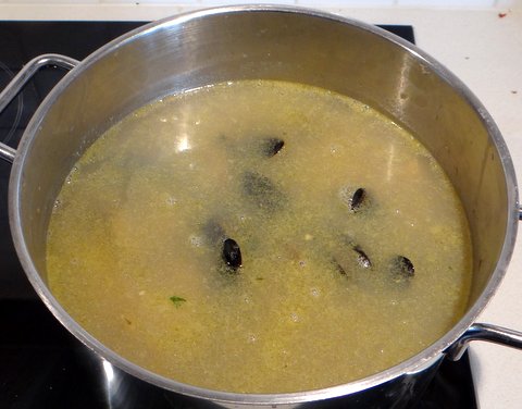 Take the seafood out of the soup with a slotted spoon and divide over warm deep plates. Ladle on some of the stock such that the seafood is covered to about half.