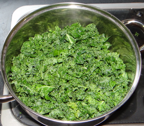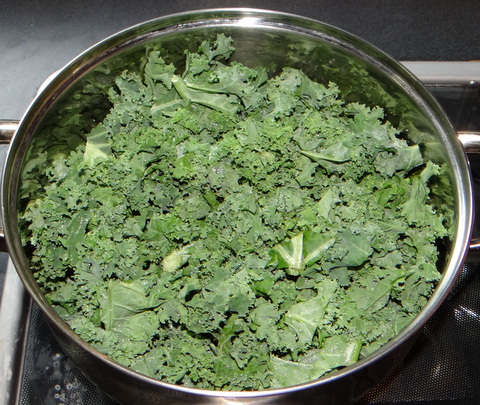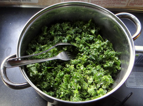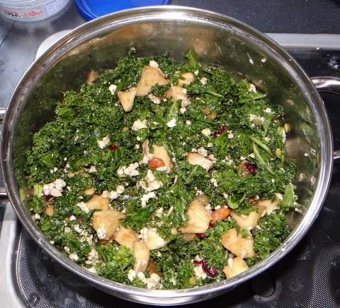 I tossed the kale with extra virgin olive oil and balsamic vinegar (since that is what I had, rather than apple cider vinegar; if you are only cooking for three weeks it doesn’t make sense to buy bottles of everything).