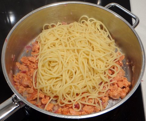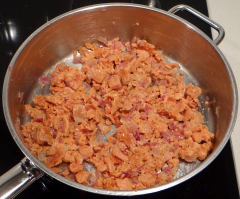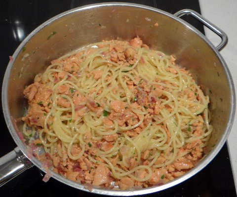 Add the salmon to the onions about 1 minute before the pasta is ready.
