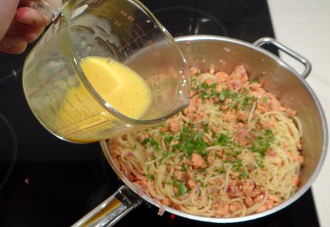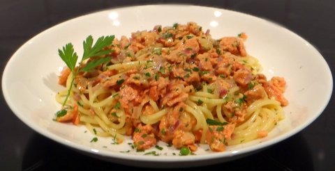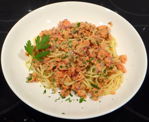 This is not an authentic dish, but my own invention. It is a fish version of the well-known spaghetti alla carbonara that uses smoked salmon and red onion instead of pancetta or guanciale. Just like real carbonara, the ‘sauce’ is raw egg that is only cooked slightly by the heat from the pasta. It only takes as long as it takes to cook the spaghetti. This dish is quick, easy, tasty, and healthy thanks to the omega-3 fatty acids in the salmon.