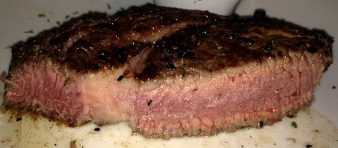 This is the steak when I remembered to take a photo after having started to cut it in half. Unfortunately this time my iPhone did not take such a great picture. I noticed right away that this was one of the most tender steaks I had ever eaten, because the knife cut through it like butter.