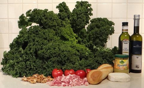 I remember being surprised when I read about kale salad for the first time on Emmy Cooks, since kale is usually eaten cooked in the Netherlands with mashed potatoes and smoked pork sausage (boerenkool met worst). Fresh kale is also mostly available in winter, not the best season for eating salads. When I was travelling in the USA, I found kale to be used for salads everywhere and even made my own ‘Trail Mix’ version of Emmy’s kale salad a few times. Since it is unseasonally warm at the moment and therefore suitable weather for a salad and I saw a nice head of kale at the market, I decided to see if the Dutch variety of kale is also suitable for kalad. Turns out it isn’t really; even though I used to top, youngest, leaves they were quite a bit tougher than the kale we had in the USA. It wasn’t bad, but I don’t think this is something I’d serve to guests.