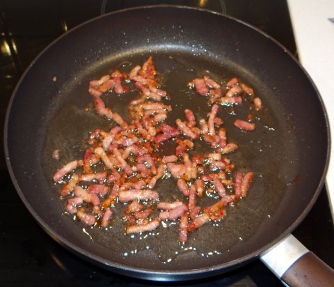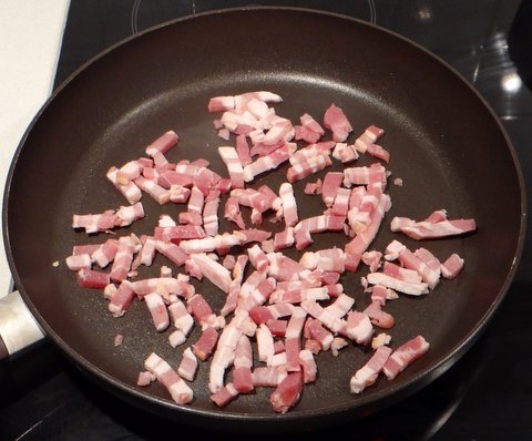 Fry the bacon in a dry non-stock frying pan over medium heat.