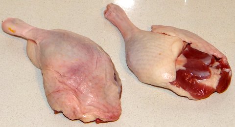 I started with a pair of duck legs. French/European ducks apparently are smaller than their American counterparts at 250 grams (about 1/2 pound) per leg, rather than the 400 grams (.9 lbs) Moulard duck legs described in Modernist Cuisine.