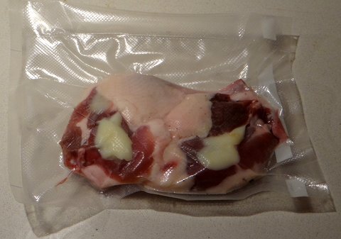 Then I sealed them into a vacuum pouch again, with a tablespoon of duck fat for each of the legs. (This duck fat was rendered from the duck breasts used for my recent duck breast experiment.)