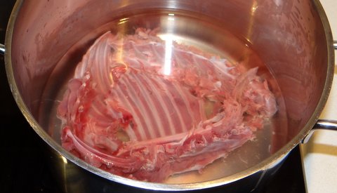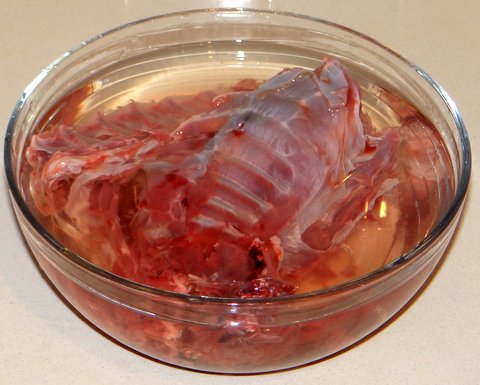 I did the butchering, and separated the hare into three parts: the loins and tenderloins, the legs, and finally the bones. I soaked the bones in cold water to remove the blood.