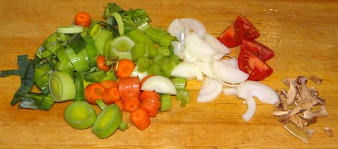 I then chopped some leeks, carrrot, celery, onion, tomatoes, and dried porcini mushrooms.