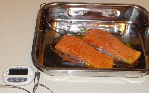 It is amazing how good the most simple dishes can be. The only thing you need for this is fresh salmon, farmed is fine, and a digital instant-read thermometer with a probe. The salmon is cooked to medium rare in the oven and will be so tender and succulent that you can eat it with a spoon.