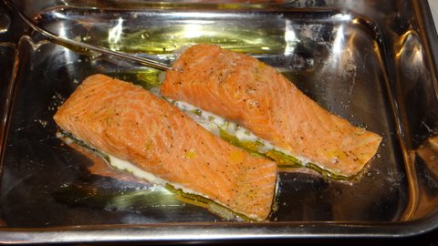 Fresh (not frozen) salmon fillet, with skin is easier to transfer from the oven dish to a plate