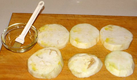 I cut the eggplant into thick slices (about 1.5 cm or 1/2 inch) and brushed them lightly with olive oil. There is no need with this variety to draw out the bitter juices with salt, because there aren’t any bitter juices.
