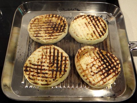 I then grilled them on the griddle, turning them to get nice grill marks. Pink eggplant cooks a bit more quickly than regular eggplant.