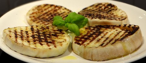 Most eggplants you see are so dark purple it’s almost black. In Italy a delicate variety is cultivated with a lighter color that is almost pink and often partially white: melanzana rosa. Not only the color is more delicate, also the texture and taste are more delicate. I tasted pink eggplant for the first time at Piazza Duomo, a great restaurant in Alba, Italy. It was so tender I couldn’t believe it. If you come across one of these beauties, it’s definitely worth picking one up. If a product is as nice as this, it only needs minimal treatment. Eggplant always needs to be cooked though, and so I decided on grilling it on a hot griddle.