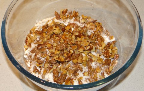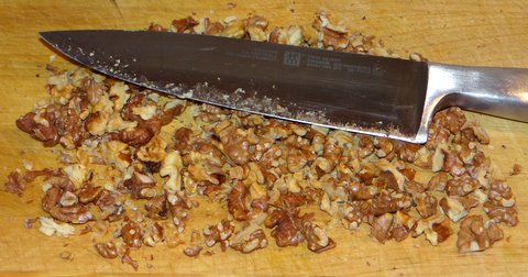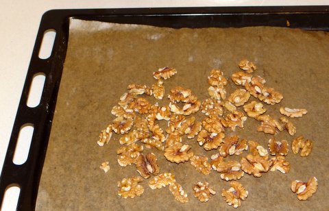 Allow the walnuts to cool a bit as they come out of the oven and then chop them coarsely.