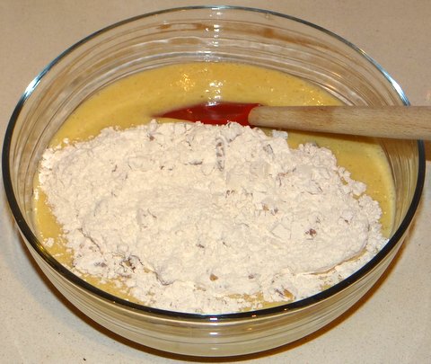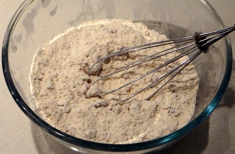 Combine the walnuts, 280 grams flour, 1 tsp baking powder, 1/4 tsp baking soda, 1/4 tsp salt, and 1 tsp ground cinnamon in a large bowl.