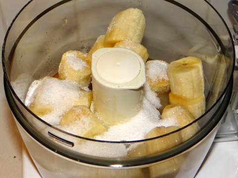 Combine 3 bananas, 150 grams sugar, 2 eggs, and 1 tsp vanilla extract in the bowl of the food processor.