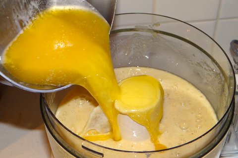 Add the melted butter (which should be cool enough by now as to not cook the eggs) and process until incorporated.
