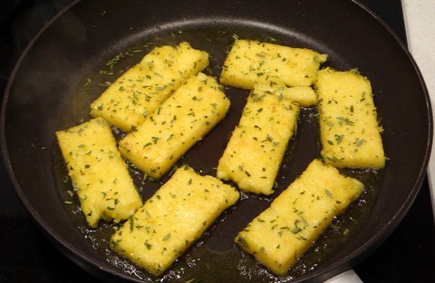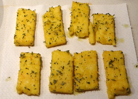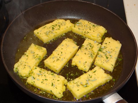 Heat olive oil in a non-stick frying pan and add the polenta. Sprinkle with half of the rosemary. Fry for a few minutes until golden.