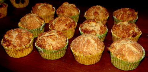 The final of five batches of a dozen muffins baked to celebrate my birthday at work: apple cinnamon muffins. I used a recipe from Putney Farm, thanks guys!  My original plan was to do only 4 batches, but I wondered if that would be enough and since I still had two apples lying around that were about to become wrinkly, I decided to make these as well. I’m glad that I did: I liked them a lot and so did my coworkers! The recipe is not very sweet, so this is also an excellent muffin to make for breakfast. Like Putney Farm suggests, you could also substitute 80 grams (1/2 cup) of the flour with wholewheat to make them even more suitable for breakfast.