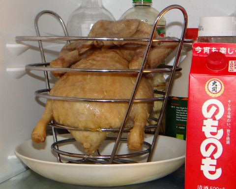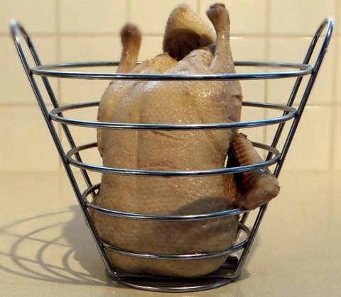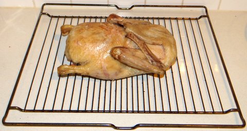 Put the duck on a rack (I found my rack for oranges to be very suitable) and let it cool to room temperature.