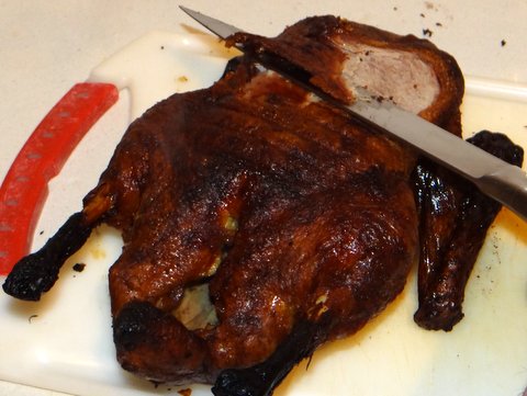 I love Peking Duck, but I always thought it was very difficult to make at home. I could hardly believe it when I saw the very simple recipe described by Stéphane on his blog My French Heaven. He just boils the whole duck with some honey and soy sauce, allows it to dry in the refrigerator and then roasts it for 1.5 hours at 250C/480F. I tried this and the result was quite good! Thanks Stéphane!