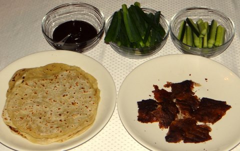 Peking Duck is one of my favorite Chinese dishes. You eat pieces of crispy skin with some cucumber and scallions with a sauce, rolled up in a pancake. In the West it is served a lot with Hoisin sauce, which is not the authentic sauce to use, but I tried the authentic sauce as well and liked Hoisin better. I did make the pancakes from scratch, but I couldn’t get the ingredients to make hoisin from scratch so I just bought a jar instead.