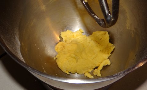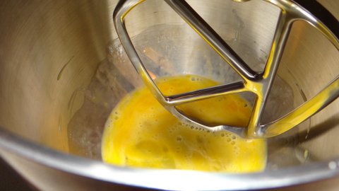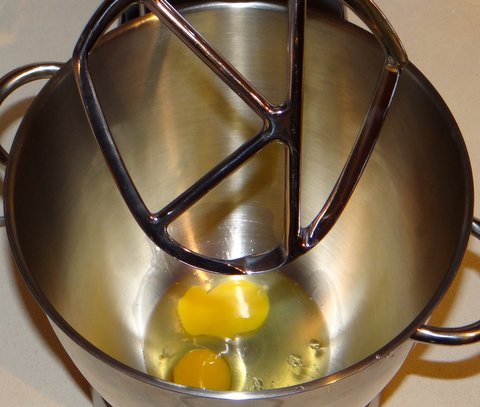 Fit the stand mixer with the paddle attachment. Break the eggs into the bowl.