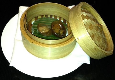 The amuse bouche are travel themed: Hong Kong, Venice, Chicago, and Moscow. The first is dim sum of scampi: both the filling and the wrapper are made from scampi. Very tasty!