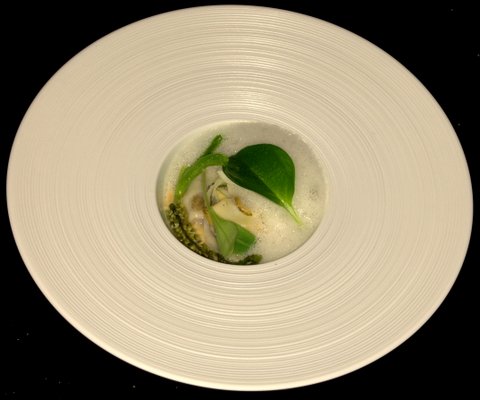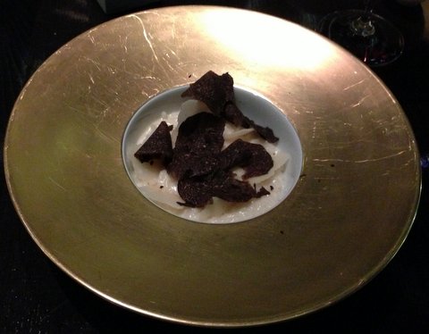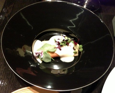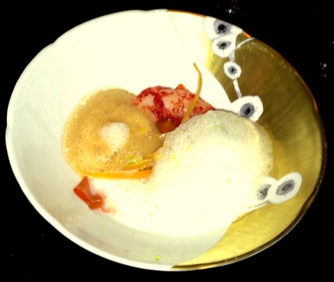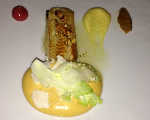 A ‘perfect egg’ with a spanish “Carabineros” prawn, 16-year old Lagavulin whisky and carrot. Very nice tastes and textures. It was paired with a Soave that already had quite strong bitter notes but became even more bitter with the dish. 9/10 for the dish, but only 8/10 including the wine pairing.