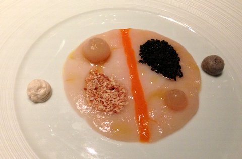 The sommelier seems to have a thing for wines with bitter notes, because also the second wine has quite a lot of them. It’s a silvaner from Franken in Germany and although it does have nice ripe white fruits, it doesn’t pair really well the pear that is served with the scallop sashimi with sesame seeds and sea buckthorn sauce. Although I love scallop, this dish doesn’t do much for me. 7/10