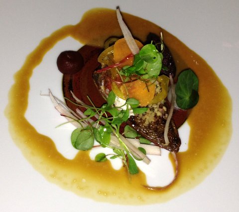 The hazelnut emulsion is great with the green cauliflower, that is a combination to remember. Unfortunately it overpowers the elegant taste of the sole and clashes with the bone-dry oaked chardonnay from Adelaide Hills. 7/10