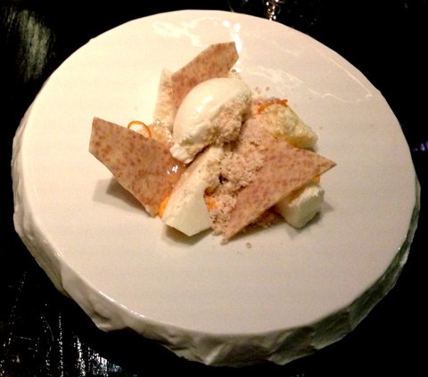 The Anjou pigeon 50:50 is called that way because it is 50% pigeon breast and 50 other ingredients. We have seen dishes named after the number of ingredients at other restaurants before. The pigeon jus had good flavor and the pigeon was tender, but we’ve had better pigeon. I wasn’t crazy about the other 50 ingredients and the pairing with a syrah/grenache from the Languedoc didn’t really work. It was not a surprise that the wine had strong bitter notes. 8/10