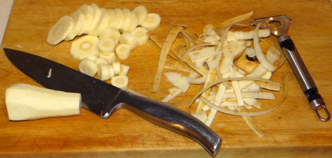 Start by cutting the ends off the parsnips and peeling them. Reserve the peels and trimmings. Cut the parsnips into 4 mm (1/6 inch) slices.