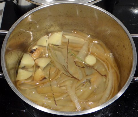 Put the parnip peels in a pot or saucepan and add just enough water to cover them. (I also added the thyme stalks for additional flavor.) Bring to a boil and allow to simmer for 30 to 60 minutes. Discard the peels and reserve the parsnip stock.