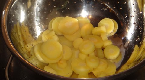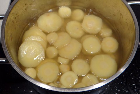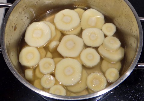 Parboil the parsnip slices in the parsnip stock with a bit of salt for about 8 minutes.