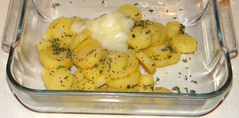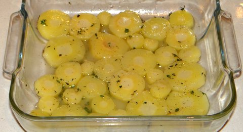 Combine the parsnip slices with the duck fat and thyme leaves in an oven proof dish.