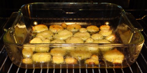 Roast at 180C/350F for 45-60 minutes until golden, flipping the slices halfway.